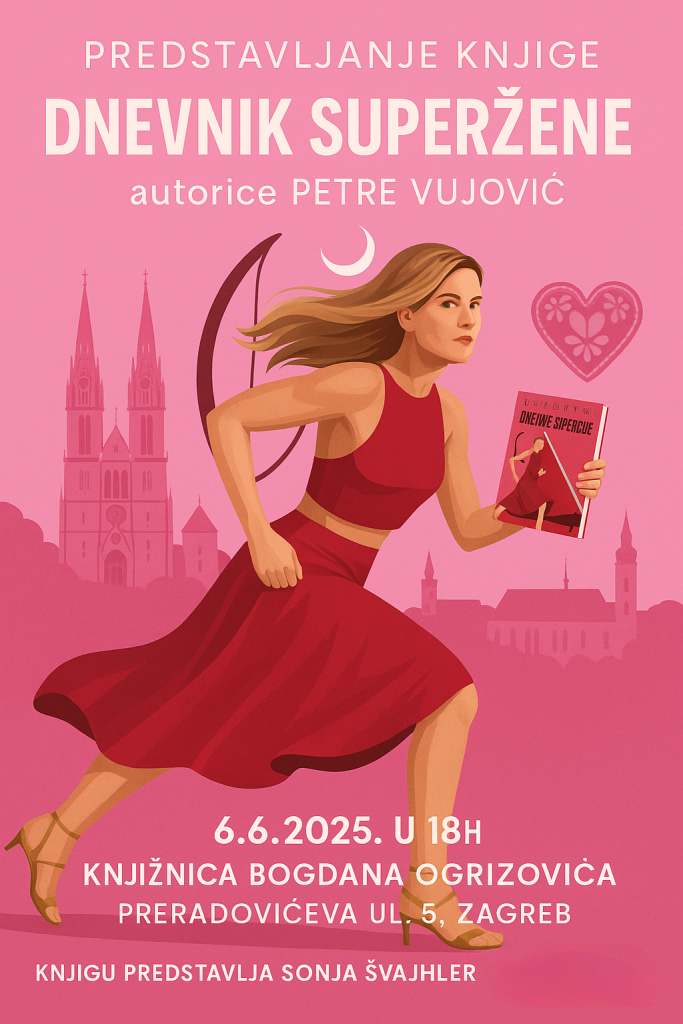 s velikim zadovoljstvom pozivamo vas na zagrebačku promociju knjige “Dnevnik superžene” autorice Petre Vujović – zbirke priča koje duhovito, iskreno i emotivno prikazuju stvarni život žene danas.